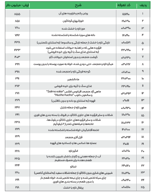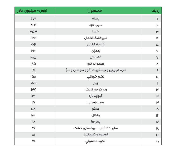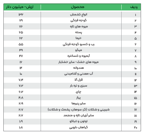 20 محصول دارای بالاترین ارزش صادراتی از ایران به جهان (فصول 1-24)